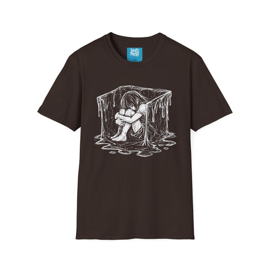 Gothic Melancholy T-Shirt — Sitting Girl in Melting Cube Illustration