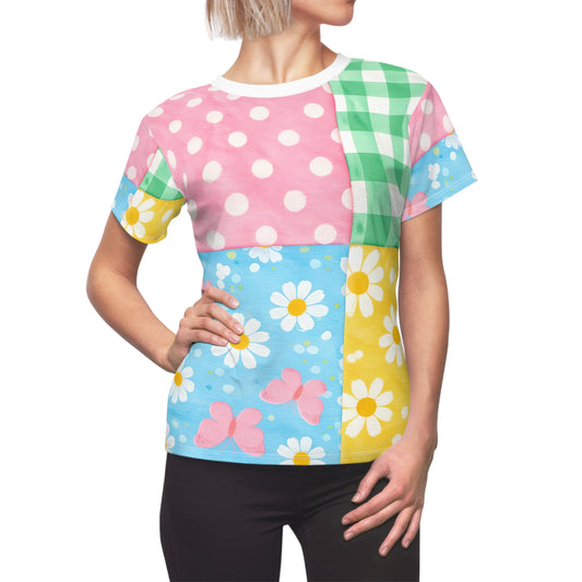 Women's Patchwork Floral spring Tee — Pastel Daisy & Polka Dot All-Over Print